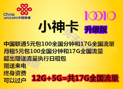 中国联通5元包100全国分钟和17G全国流量 小神卡 升级版 月租5元包100全国分钟和17G全国流量 超出赠送流量执行日租包 赠送来电 终身资费 可以过户 数量有限 卖完...