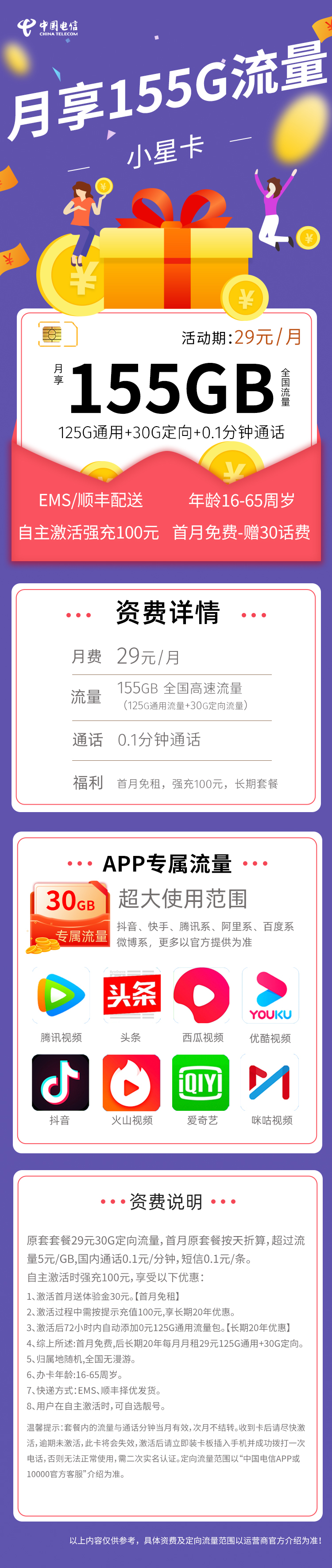 3激活后72小时内自动添加0元125G通用流量包。[长期20年优惠4、综上所述:首月免费后长期20年每月月租29元125G通用+30G定向。