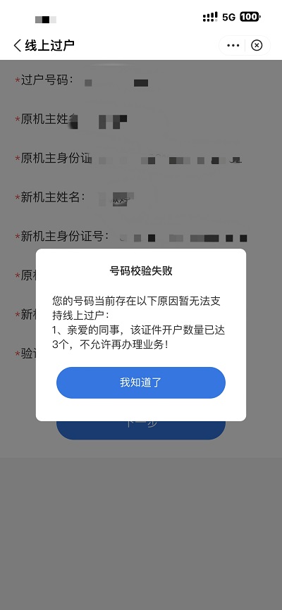 还有联通esim虽然不占5户,但是线上过户功能已经开始检测,检测到esim也算一个户