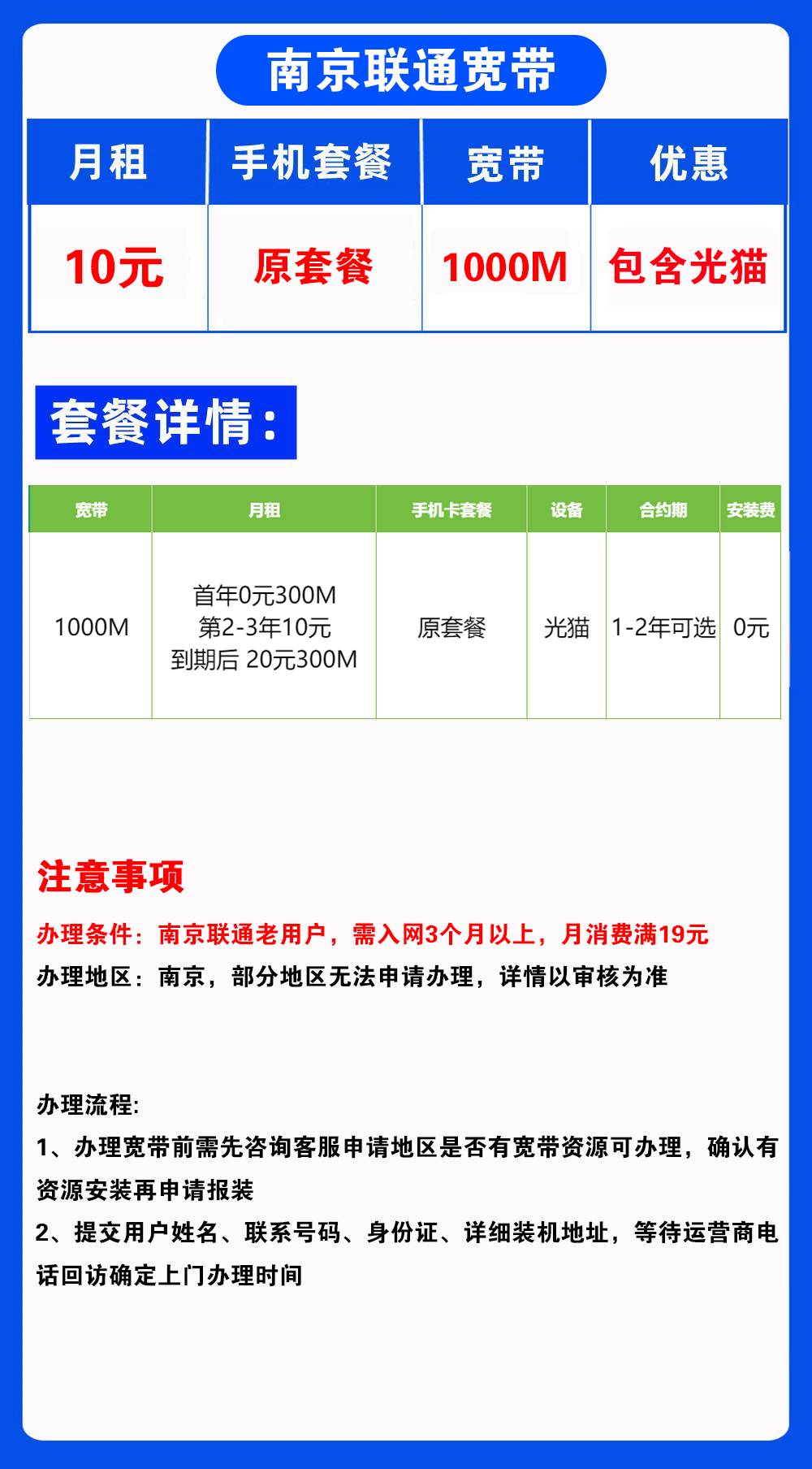 江苏南京联通老用户专享套餐 南京联通老用户专享 首年0元300M 2年10元千兆 免安装费 下单链接地址:https://shop.gantanhao.vip/webapp/merchant/templet1.html?...